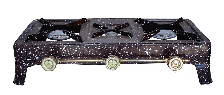 Επαγγελματικό πετρογκάζ  με 3 εστίες μαγειρέματος, κατασκευασμένο από μέταλλο με εμαγιέ επίστρωση.