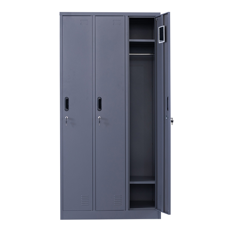 Τρίφυλλη συναρμολογούμενη μεταλλική ντουλάπα – ιματιοθήκη (locker). Περιλαμβάνει εσωτερικό μικρό ράφι στο άνω μέρος, μεταλλική ράβδο στήριξης ρούχων, ειδικό αποθηκευτικό χώρο στη βάση για υποδήματα και καθρέπτη στο εσωτερικό της πόρτας.