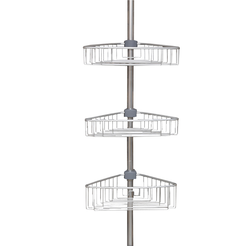 Γωνιακή ραφιέρα μπάνιου 3όροφη από αλουμίνιο με πτυσσόμενη ράβδο (135-270cm) η οποία προσαρμόζεται μεταξύ δαπέδου και οροφής της ντουζιέρας.