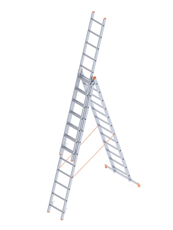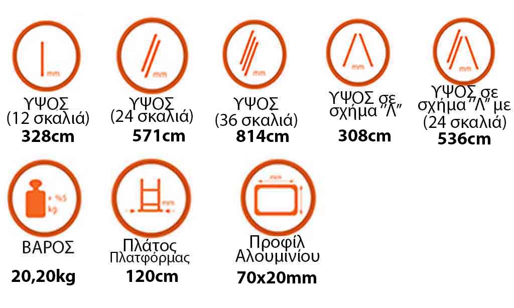 Αλουμινίου αναπτυσσόμενη σκάλα 3×12 σκαλιά, είτε σε σχήμα ”Λ” χωρίς επέκταση με μέγιστο ύψος 308 εκατοστά είτε σε σχήμα ”Λ” με επέκταση του τρίτου τμήματος με μέγιστο ύψος 536 εκατοστά είτε σε πλήρη ανάπτυξη ρυθμίζοντας το επιθυμητό ύψος (από 12 έως 36 σκαλιά) το οποίο φτάνει έως τα 814 εκατοστά σε πλήρες ανάπτυγμα.