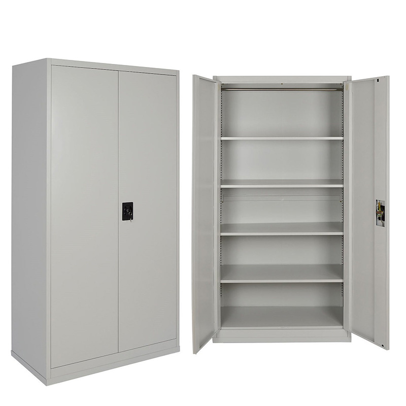 Δίφυλλη μεταλλική ντουλάπα με 4 ρυθμιζόμενα ράφια, ράβδο για κρεμάστρες, κλειδαριά, χωρίς πόδια, κατασκευασμένη από γαλβανιζέ χάλυβα πάχους 0,6mm (πόρτες/πλευρές/οροφή) και 0,8mm (πάτωμα), βαμμένη με ειδική ηλεκτροστατική βαφή για maximum αντοχές στις καιρικές συνθήκες και τις διαβρώσεις.