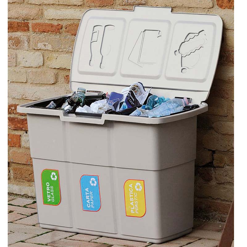 Πλαστικός κάδος ανακύκλωσης με τρεις χώρους συνολικής χωρητικότητας 75 λίτρων, ενιαίο καπάκι και υποδοχές για τις σακούλες.