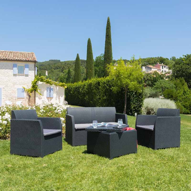 Καθιστικό-σαλόνι 4θέσεων. Το set διαθέτει διθέσιο καναπέ, δύο πολυθρόνες, τραπέζι με αποθηκευτικό χώρο και τέσσερα μαξιλάρια με αφαιρούμενα καλύμματα.