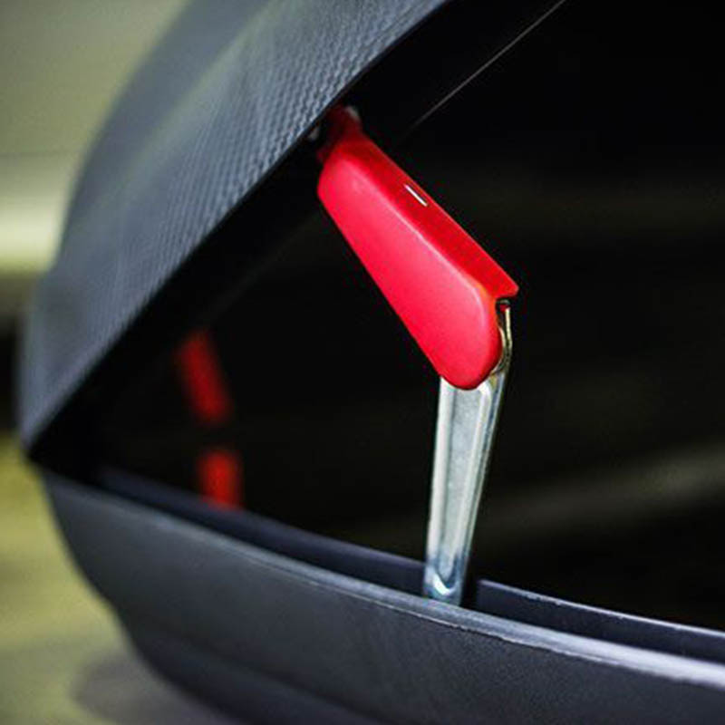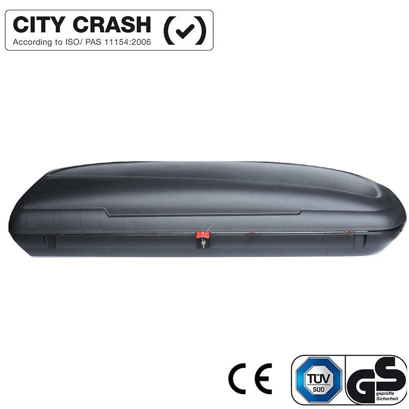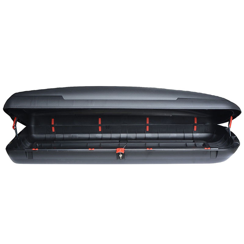 Μπαγκαζιέρα οροφής αυτοκινήτου χωρητικότητας 480 λίτρων από πολυπροπυλένιο με κεντρικό σύστημα κλειδώματος (2 κλειδιά) και ρύθμιση της θέσης πρόσδεσης ανάλογα με τις σχάρες του αυτοκινήτου.