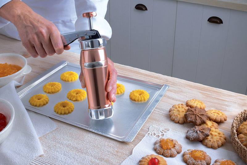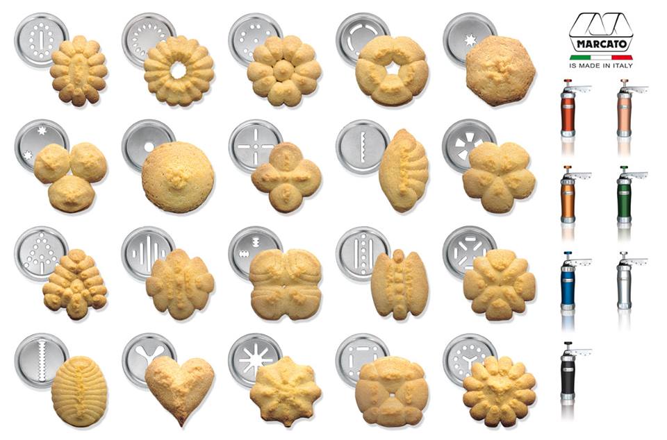 Μπισκοτομηχανή από ανοδιωμένο κράμα αλουμινίου με 20 διαφορετικές κεφαλές (σχέδια) για παρασκευή μπισκότων και κουλουριών της MARCATO.