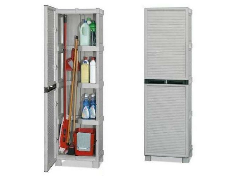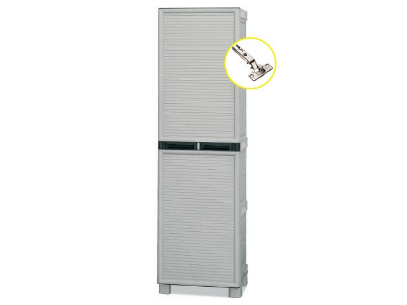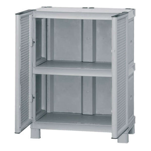 Πλαστική ντουλάπα δίφυλλη από πολυπροπυλένιο με 3 ράφια, εσωτερικό χώρισμα και μεταλλικούς μεντεσέδες. Περιλαμβάνει οδηγίες συναρμολόγησης.