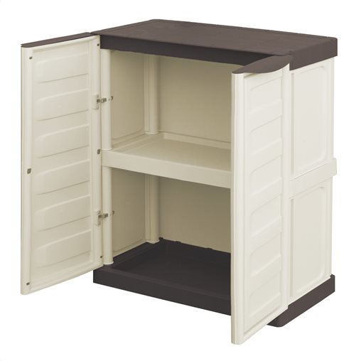Πλαστική ντουλάπα δίφυλλη από πολυπροπυλένιο με 1 εσωτερικό ράφι και μεταλλικούς μεντεσέδες. Περιλαμβάνει οδηγίες συναρμολόγησης.