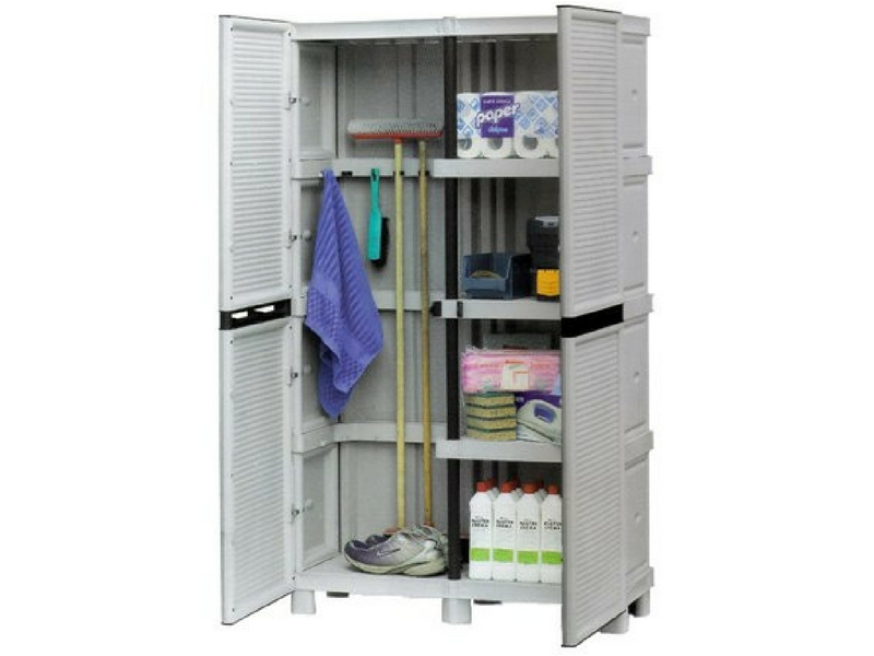 Πλαστική ντουλάπα δίφυλλη από πολυπροπυλένιο με 3 ράφια, εσωτερικό χώρισμα και μεταλλικούς μεντεσέδες. Περιλαμβάνει οδηγίες συναρμολόγησης.