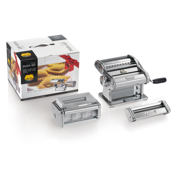 Σετ που περιλαμβάνει τη μηχανή φύλλου και ζυμαρικών Atlas150 Classic και 2 αξεσουάρ για παρασκευή ζυμαρικών Spaghetti και Ravioli PASTASET.