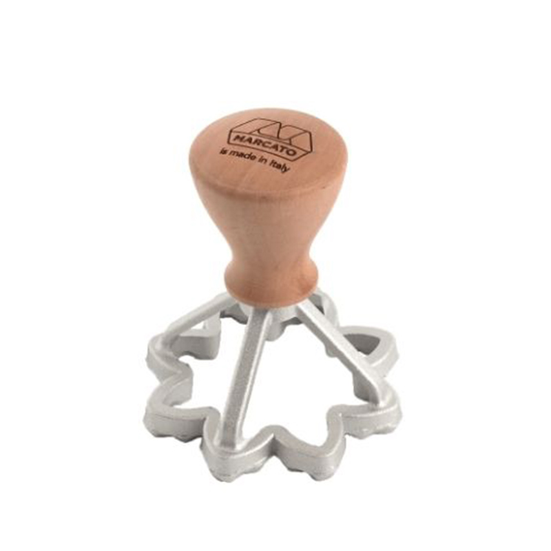 Σφραγίδα-κόφτης για παρασκευή ζυμαρικών Ravioli, μπισκότων κ.α. με σχέδιο λουλούδι (70mm) από ανοδιωμένο κράμα αλουμινίου με ξύλινη χειρολαβή της MARCATO.