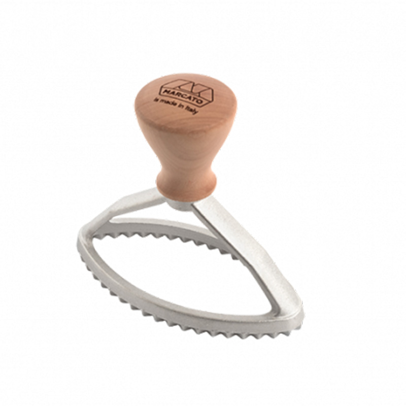Σφραγίδα-κόφτης για παρασκευή ζυμαρικών Ravioli, μπισκότων κ.α. με σχέδιο οβάλ (100mm) από ανοδιωμένο κράμα αλουμινίου με ξύλινη χειρολαβή της MARCATO.