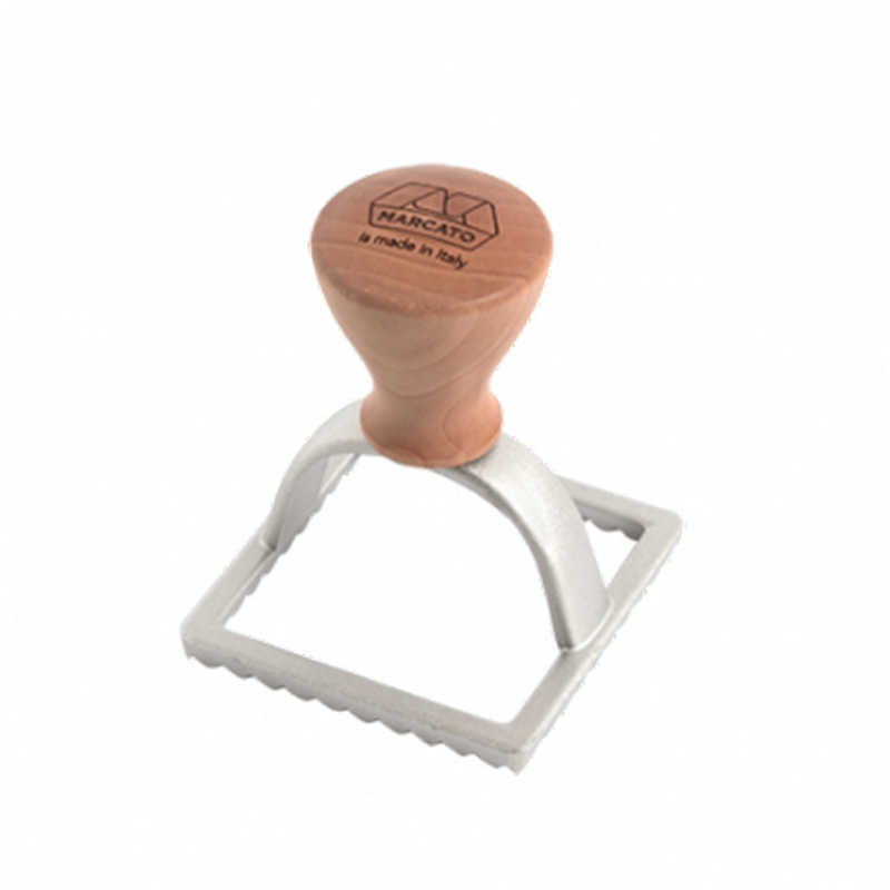 Σφραγίδα-κόφτης για παρασκευή ζυμαρικών Ravioli, μπισκότων κ.α. με σχέδιο τετράγωνο (58mm) από ανοδιωμένο κράμα αλουμινίου με ξύλινη χειρολαβή της MARCATO.
