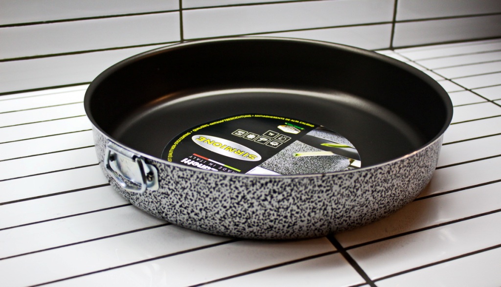 Στρογγυλό ταψί από βαμμένο αλουμίνιο. Διαθέτει αντικολλητική εσωτερική επίστρωση και χειρολαβή στην εξωτερική επιφάνεια.