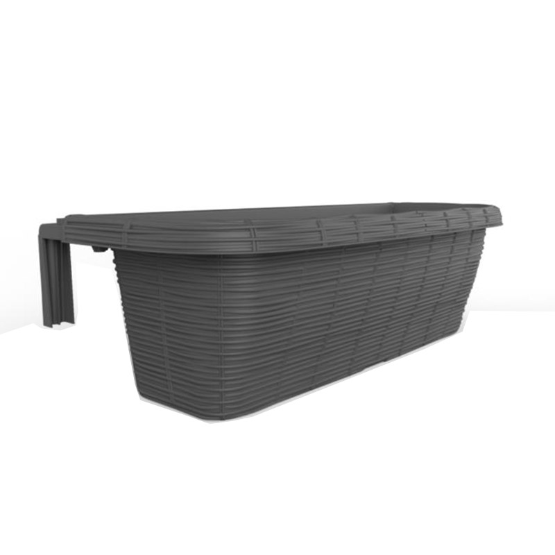 Ζαρντινιέρα με κομψή πλεκτή όψη από ανακυκλώσιμο ανθεκτικό πλαστικό με σύστημα αποστράγγισης και ρυθμιζόμενους βραχίονες με ανάπτυγμα από 3-11 εκατοστά ώστε να εφαρμόζει αποτελεσματικά σε κάγκελα και κουπαστές διαφόρων διαστάσεων.