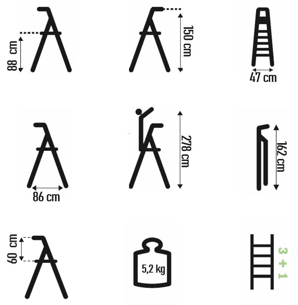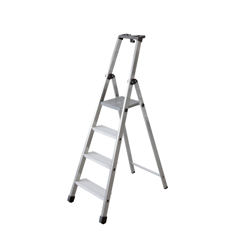 Σκάλα αλουμινίου με 3+1 σκαλιά. Τα σκαλοπάτια είναι φαρδιά, πλάτους 11 εκατοστών και αντιολισθητικά. Το πλατύσκαλο παράγεται από ρητίνη με ενίσχυση χάλυβα, και στη χειρολαβή υπάρχει ενσωματωμένη εργαλειοθήκη. Διαθέτει πιστοποίηση EN131 (TÜV).